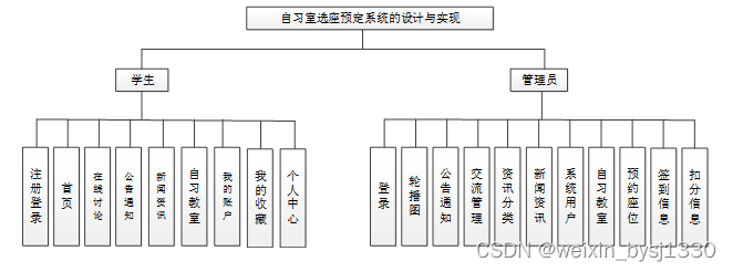 自习室选座预定系统我划分为了管理员模块以及学生用户模块这两大部分。