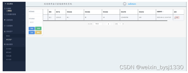 (2)系统用户:管理员点击“系统用户”这一菜单会显示管理员和学生用户这两个子菜单,管理员可以对这两个角色的信息进行增删改查操作;