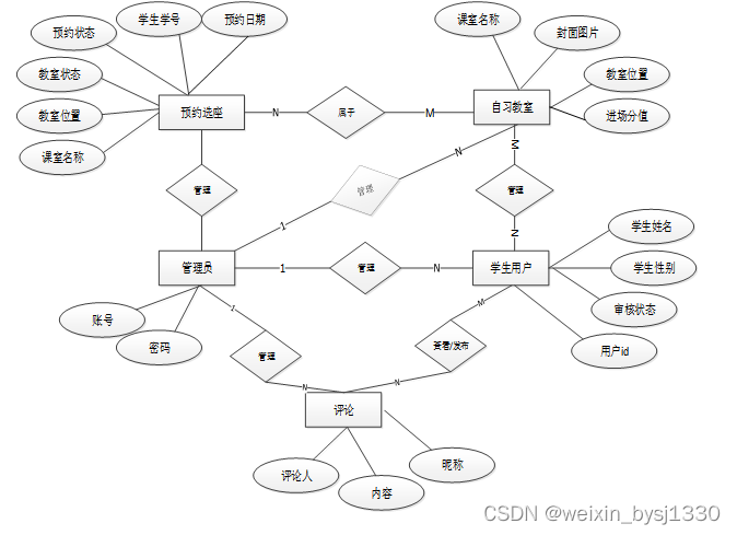 下面是整个自习室选座预定系统中主要的数据库表总E-R实体关系图。