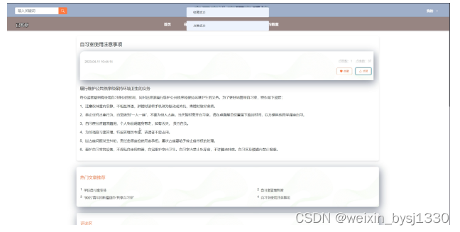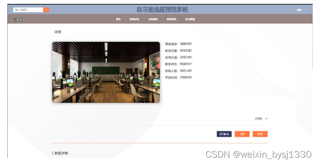 (5)自习教室:当用户点击“自习教室”这一菜单按钮,会显示管理员在后台发布的所有的自习教室,支持通过关键词对自习教室进行搜索,选择需要的自习教室点击可以进入到自习教室详细的介绍界面,在详细界面可以查看到自习教室的课室名称、教室位置、进场分值、教室状态、容纳人数、开放时间等信息,同时可以进行预约选座、点赞、收藏、评论操作;