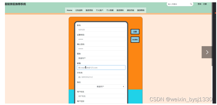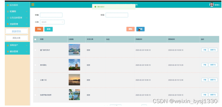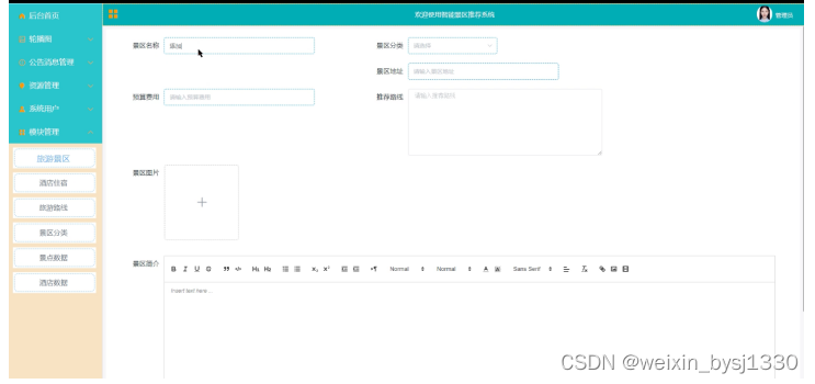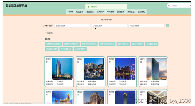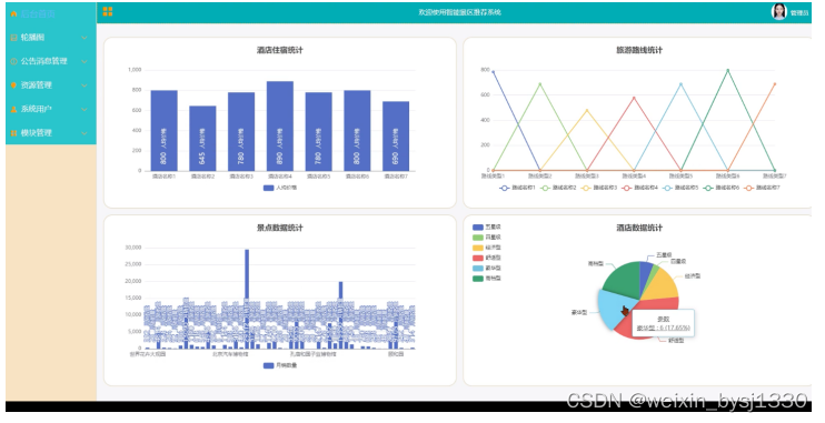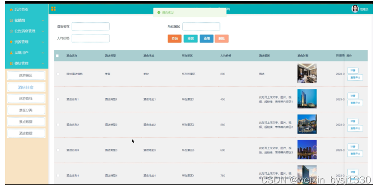 该系统实现了智能景区推荐管理内部的各种工作流程计算机管理化,其中包括管理员的系统首页、轮播图、公告消息、资源管理(旅游资讯、资讯分类)系统用户(管理员、普通用户)模块管理(旅游景区、酒店住宿、旅游路线、景区分类、景点数据、酒店数据)等功能。