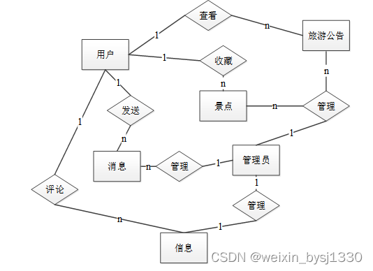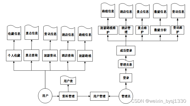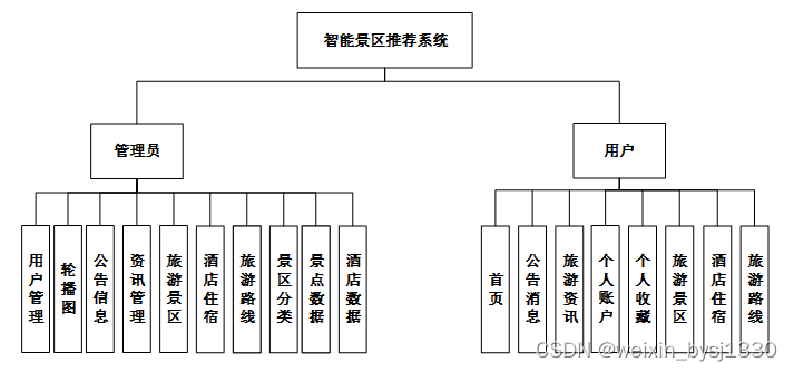根据对系统的功能进行分析可以总结智能景区推荐系统的具体功能模块包括下面的几个主要的功能模块:该系统主要从两大模块进行设计的,首先就是用户参与操作需要的模块,此外还需要有管理员用到的模块,两者之间不是互相独立的,他们之间有着密切的联系,同数据库表中的数据连接起来进行操作。每个模块访问相同的数据库,但访问的表不同。系统的各个功能模块是根据所收集的资料研究得到的。在以上分析功能的基础上,系统模块分为多个模块。用户含有的功能有首页、公告消息、旅游资讯、个人账户、个人收藏、旅游景区、酒店住宿、旅游路线等,退出登录等功能,管理员含有的功能有修改密码,用户管理、景点管理、景点类型、酒店信息、旅游路线、数据分析等功能。
