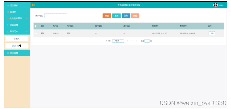 用户管理模块:管理员查看用户基本信息,并实现对用户信息的增加、删除、修改等功能。