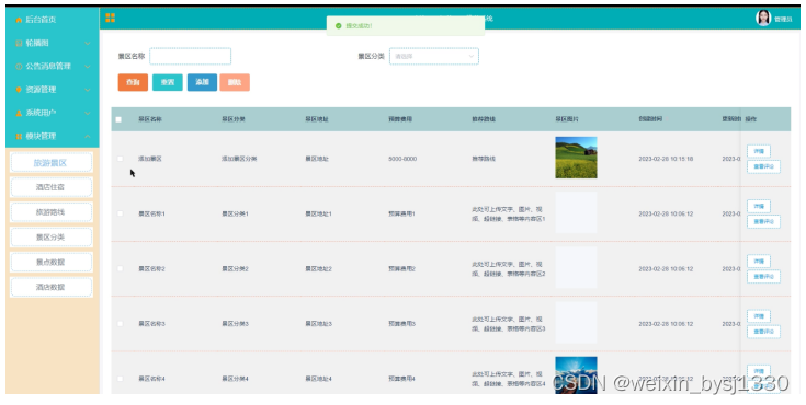 景点管理模块:管理员查看景点,并且添加景点数据,也能够删除景点数据。