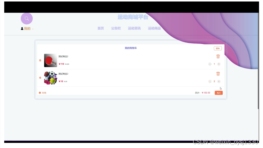 (6)购物车:用户对喜欢的运动产品可以加购,在购物车里面,可以查看到所有加购的商品,支持对商品数量的更改、删除商品,可以进行选择购买。