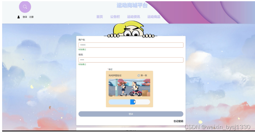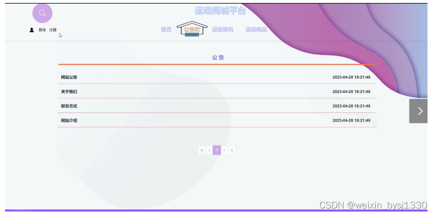 (2)查看运动商城平台的首页信息:运动商城平台的首页信息包含了首页、公告栏、运动资讯、运动商品等。