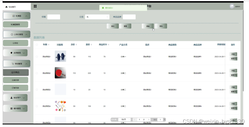 (7)运动商品:点击“运动商品”可以查看到系统中的商品信息,如果想要添加新的商品,点击“添加”按钮,根据提示输入上商品信息,点击“提交”按钮,信息没有错误的话,添加就完成了,如果商品信息有误,可以对商品更新维护,也可以直接删除某一商品。