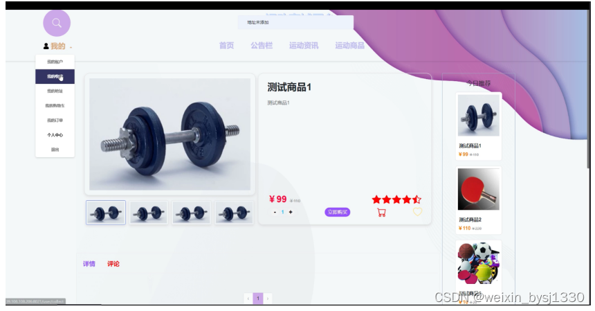 (5)运动商品详情:用户可以点击搜索查看自己喜欢的运动产品,点击可以进入到运动产品的详细界面当中,在详情界面可以查看运动产品的各种参数,对喜欢的运动产品可以加购、立即购买、收藏、评论。