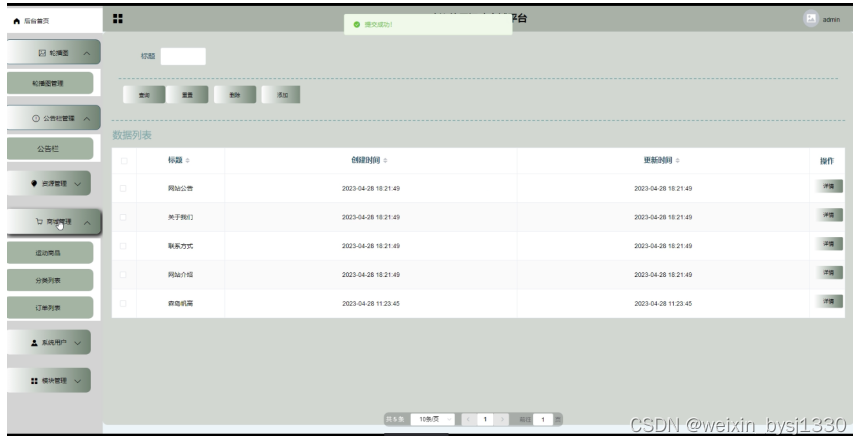 (1)轮播图:点击“轮播图”可以查看到系统中的轮播图信息,如果想要添加新的轮播图,点击“添加”按钮,根据提示输入上轮播图信息,点击“提交”按钮,信息没有错误的话,添加就完成了,如果轮播图信息有误,可以对轮播图更新维护,也可以直接删除某一轮播图。