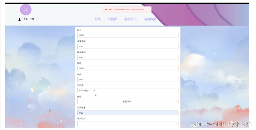 (1)注册登录:游客可以随时进入到系统中,对系统中的信息浏览,但是想要实现运动产品购买、收藏、留言反馈以及评论等操作,就必须有这个系统的账号,如果没有本系统账号的话,可以点击“注册”按钮,根据提示输入注册的信息,然后再进行登录,登录成功以后,点击“我的”这以按钮对个人信息以及操作的信息进行管控。