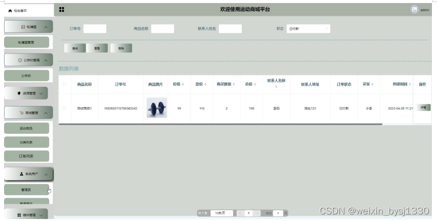 (3)商城管理:主要包括商品列表、商品类目管理、商品添加、商品信息、订单管理等功能。