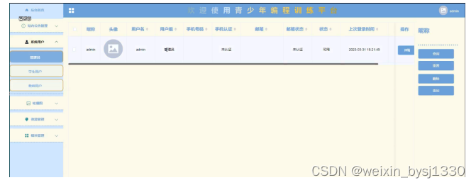 青少年编程训练平台的理员拥有最高的权限,可以对用户信息、系统信息以及青少年编程训练平台相关信息进行管控。