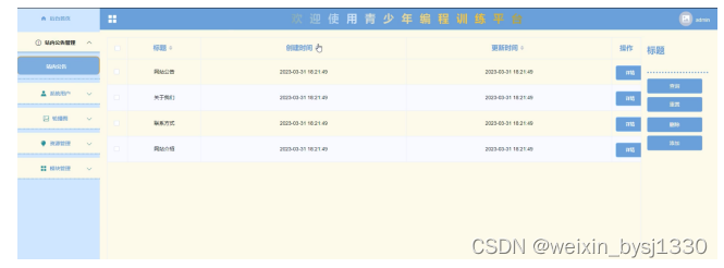 (3)站内公告/轮播图管理:管理员可以对系统前台展示的轮播图以及站内公告进行增删改查,方便用户进行查看。