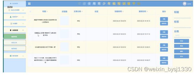 (6)资源管理:管理员可以对青少年编程训练平台前台展示的编程测试、编程资讯以及资讯所属的分类进行管控。
