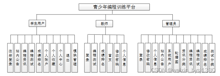 青少年编程训练平台整体的功能模块包括管理员+学生用户+教师用户三个模块,实现了对青少年编程训练平台相关信息的查询管理,系统功能模块如图所示。