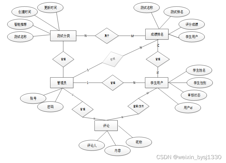 青少年编程训练平台的E-R图主要是根据学生用户以及管理员的实际需求设计的,用户注册以后可以查看成绩排名,只有注册登录以后才可以进行成绩排名查询;管理员对整个系统的评论、公告等进行综合管理。青少年编程训练平台采用的是MYSQL的数据库进行存储的,数据库里面储存了很多的表信息,在此罗列出来一些主要的数据库E-R模型图。