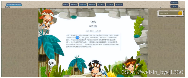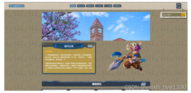 (1)首页信息:当用户进入本青少年编程训练平台的前台的时候,首先展示在眼前的是导航栏、编程测试、站内公告、编程资讯、个人账户、个人收藏、成绩排名等信息,用户可以根据自己个人的需求进行查看;