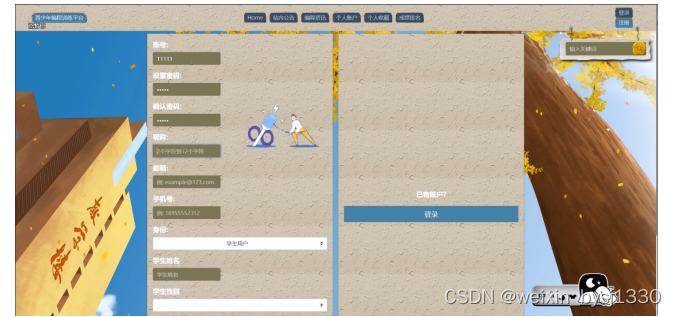 不是青少年编程训练平台中用户的是可以在线进行注册的,当用户点击右上角“注册”按钮的时候,当填写上自己的账号+密码+确认密码+昵称+邮箱+手机号等信息后再点击“注册”按钮后将会先验证输入的有没有空数据,再次验证密码和确认密码是否是一样的,最后验证输入的账户名和数据库表中已经注册的账户名是否重复,只有都验证没问题后即可注册成功。其用户注册界面展示如下图4.2所示。