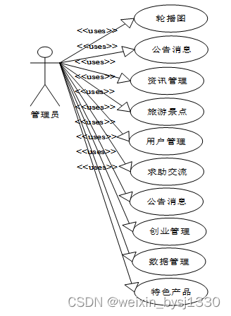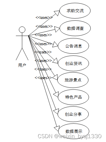 系统设计的目的是分析系统包括的所有功能结构,为开发人员设计开发和实现系统做好准备工作。经过前期的需求调查、分析和整理之后,确定的总体需求主要包括多个模块,分别是:求助交流、数据调查、公告消息、创业资讯、旅游景点、特色产品、创业分享、数据展示。系统整体角色分为二个部分,一是用户、最后是管理员。权限分布也是很明显,用户是在除去浏览信息之外还具有查询和管理自己首页、求助交流、数据调查、公告消息、创业资讯、旅游景点、特色产品、创业分享、数据展示等权限;管理员是最高权限拥有者。