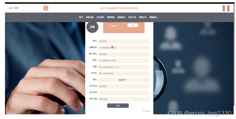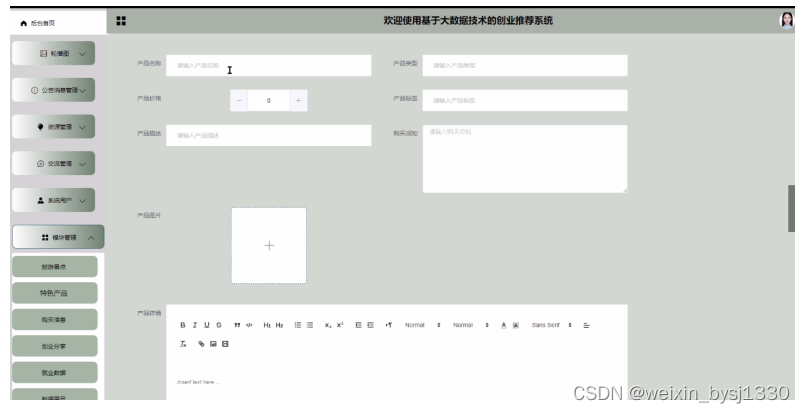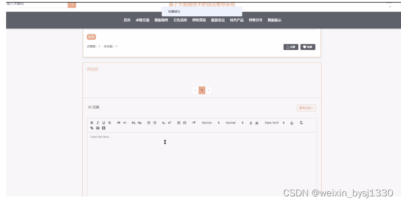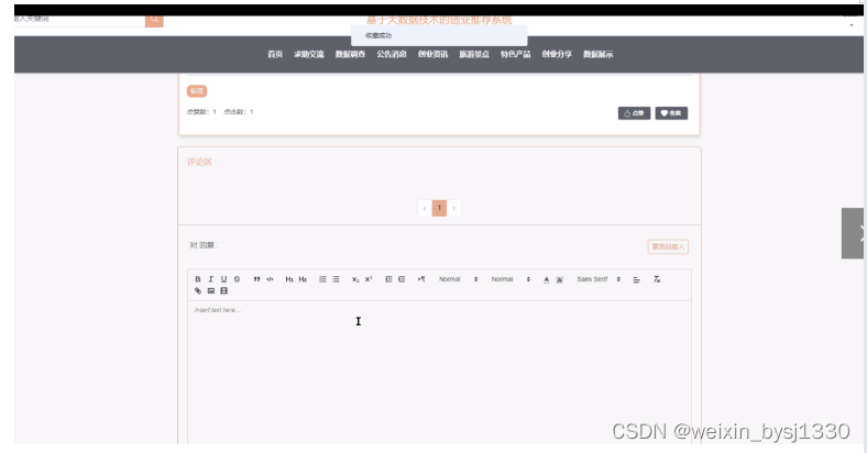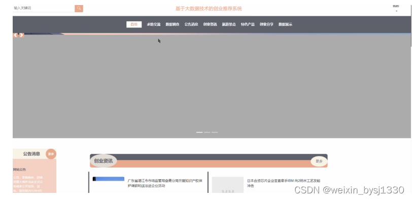 This design mainly implements a business recommendation system based on big data technology that combines the advantages of humanization, efficiency, and convenience, and completes the rotation chart, announcement message Resource management (entrepreneurship information, information classification, data survey) System user (administrator, ordinary user) module management (homepage, help exchange, announcement message, entrepreneurship information, tourist attractions, featured products, entrepreneurship sharing, employment data, data display) and other functional modules. The system communicates with the server through a browser to achieve data interaction and change. This system improves work efficiency and reduces errors and omissions in data storage through scientific management methods and convenient services. The entrepreneurship recommendation system based on big data technology uses Java language, uses SSM technology based on MVC mode for development, and uses MyEclipse 2017 CI 10 compiler for writing. In terms of data, it mainly uses Microsoft's MySQL relational database as the data storage medium, and cooperates with the previous HTML+CSS technology to complete the system development.