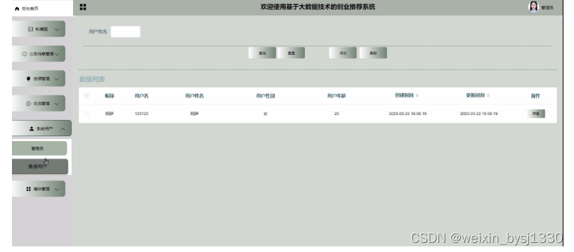 通过基于大数据技术的创业推荐系统 的开发,本人巩固了之前学过的知识,如今将平时所学到的知识融合在设计中,在设计过程中,做了很多的准备,首先,在数据库系统的设计过程中,尤其是在数据库的工作原理、工作特点,对其深刻的讨论,与此同时,对于小型站点来说,最好服务器的选择,其次,利用所学的知识点分析所做的系统,并在此基础上设计。