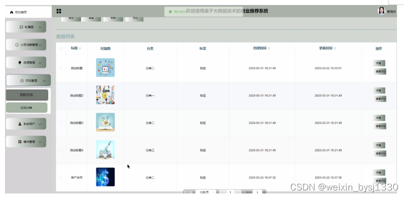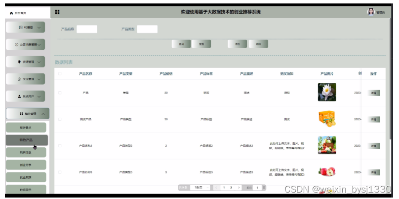 本设计主要实现集人性化、高效率、便捷等优点于一身的基于大数据技术的创业推荐系统 ,完成轮播图、公告消息、资源管理(创业资讯、资讯分类、数据调查)系统用户(管理员、普通用户)模块管理(首页、求助交流、公告消息、创业资讯、旅游景点、特色产品、创业分享、创业数据、数据展示)等功能模块。系统通过浏览器与服务器进行通信,实现数据的交互与变更。本系统通过科学的管理方式、便捷的服务提高了工作效率,减少了数据存储上的错误和遗漏。基于大数据技术的创业推荐系统 使用Java语言,采用基于 MVC模式的SSM技术进行开发,使用 MyEclipse 2017 CI 10 编译器编写,数据方面主要采用的是微软的MySQL关系型数据库来作为数据存储媒介,配合前台HTML+CSS 技术完成系统的开发。