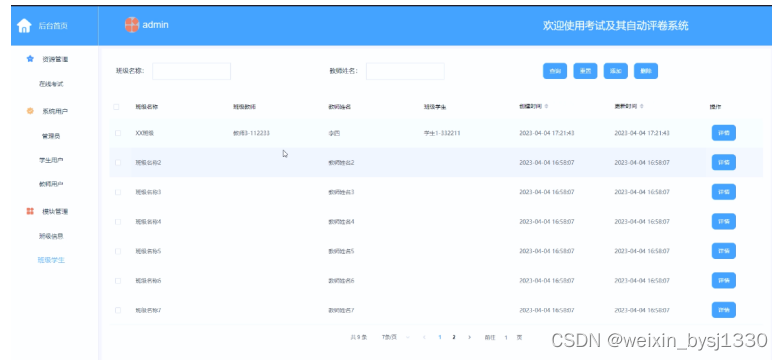 (5)班级学生:管理员点击“班级学生”会显示出所有的班级学生,支持通过班级名称或者班级教师对班级学生进行查询,如果想要添加新的班级学生,点击“添加”按钮,输入相关信息,点击“提交”按钮就可以添加了,同时可以选择某一条班级学生,点击“删除”进行删除。