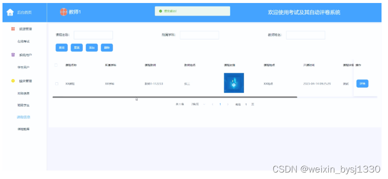 (6)课程信息:教师点击“课程信息”会显示出所有的课程信息,支持通过课程名称或者课程教师对课程信息进行查询,如果想要添加新的课程信息,点击“添加”按钮,输入相关信息,点击“提交”按钮就可以添加了,同时可以选择某一条课程信息,点击“删除”进行删除。