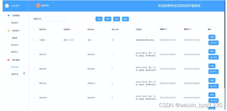 (4)班级信息:管理员点击“班级信息”会显示出所有的班级信息,支持输入班级名称或者班级教师或者教师姓名对班级信息进行查询,如果想要添加新的班级信息,点击“添加”按钮,输入相关信息,点击“提交”按钮就可以添加了,同时可以选择某一条班级信息,点击“删除”进行删除,也可以点击后面的“录入学生”按钮对班级信息的学生信息进行更新维护;