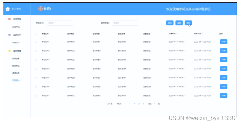 点击“课程题库”这个菜单,可以查看到系统中所有添加的课程题库,支持通过课程名称或者题库类型对课程题库进行查询,如果想要了解某一课程题库的详细信息,点击后面的“详情”会进入详情界面。界面如下图4.7所示。