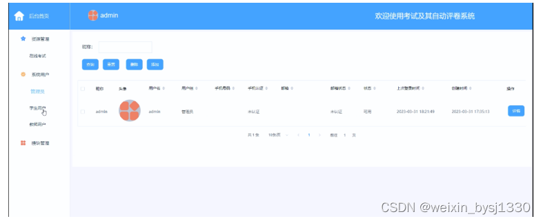 (3)系统用户:管理员可以对系统中所有的用户角色进行管控,包含了管理员、教师用户以及学生用户这三种角色,如果需要添加新的用户,点击页面中的“添加”按钮根据提示输入上用户信息,点击“提交”以后在对应的用户界面就可以查看到了,可以点击用户后面的“删除”按钮直接删除某一用户。