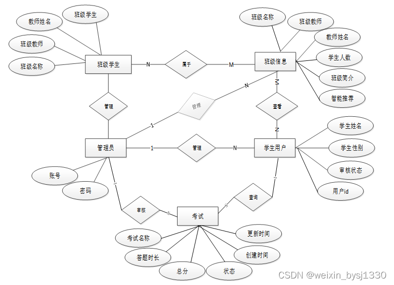 下面是整个考试及其自动评卷系统中主要的数据库表总E-R实体关系图。
