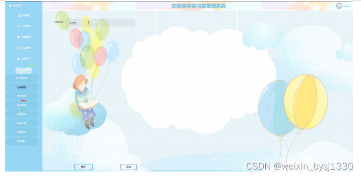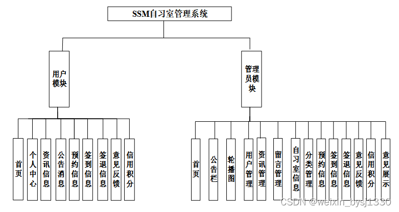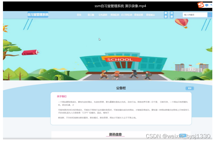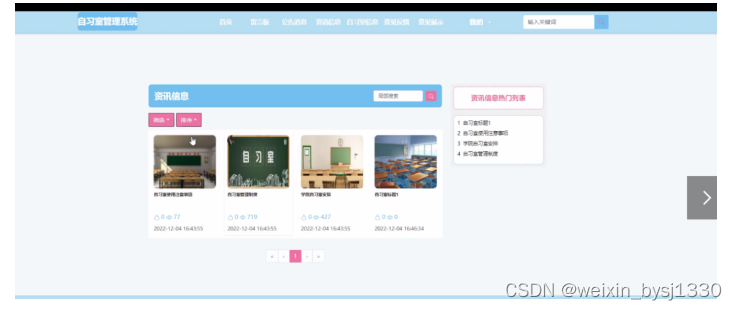 2. 系统功能还不够完善,无法提供丰富多彩的在线功能,只能实现管理员:首页、轮播图、公告栏、资源管理(资讯信息、资讯分类)交流管理(留言板、留言板分类)系统用户(管理员、系统用户)模块管理(自习室信息、分类管理、预约信息、签到信息、签退信息、意见反馈、信用积分、意见展示)系统管理等一系列功能。
