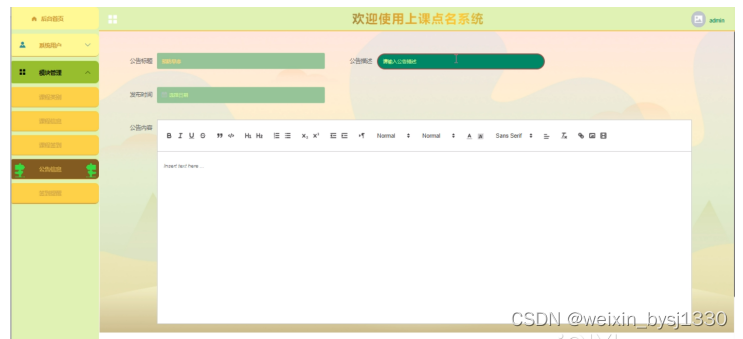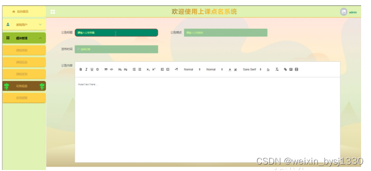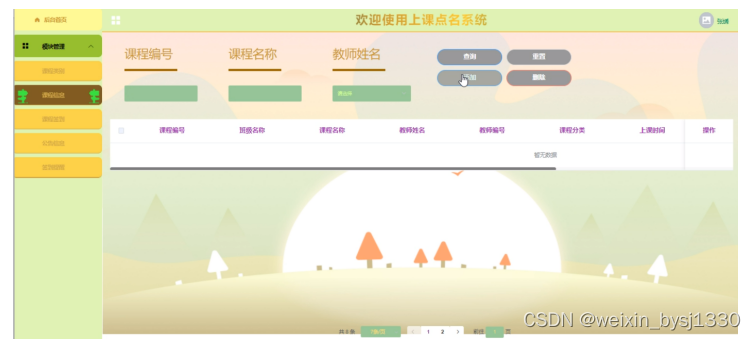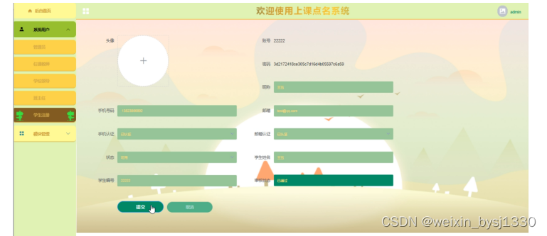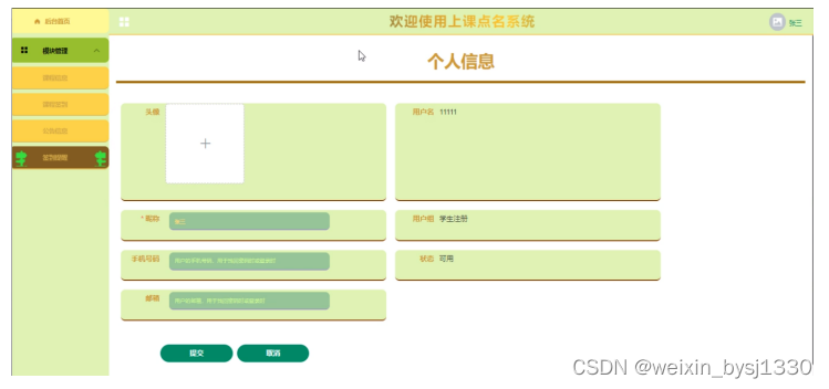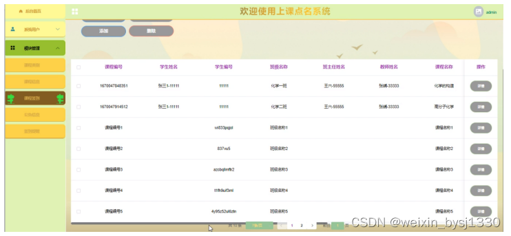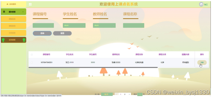 管理员对课程签到管理进行编辑课程编号、学生姓名、学生编号、班级名称、班主任姓名、教师姓名、课程名称等操作,可以详情进行添加、删除、修改、查看等操作。提醒信息效果图如图5.6所示。