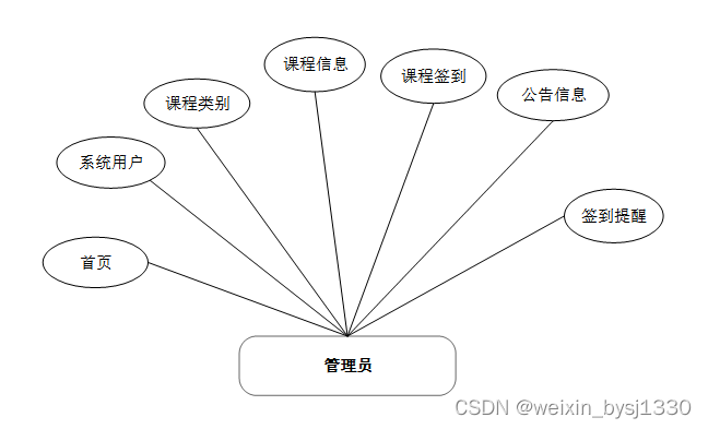 系统中的核心学生是管理员,管理员登录后,通过管理员菜单来管理后台系统。主要功能有:后台首页、系统用户(管理员、任课老师、学校领导、班主任、学生注册)、模块管理(课程类别、课程信息、课程签到、公告信息、签到提醒)等功能。管理员用例如图3-7所示。