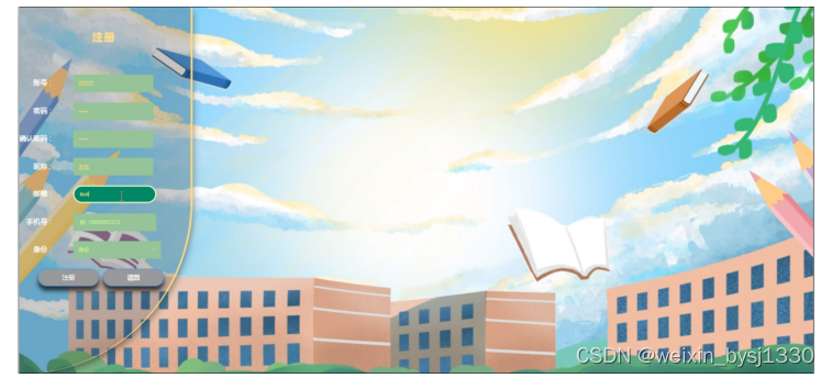 在登陆页面填写账号、密码、昵称、确认密码、邮箱、手机号、身份等信息,进行注册如图5.10所示。