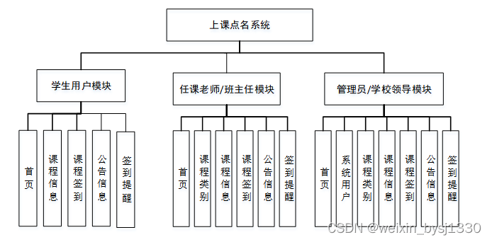 系统架构图属于系统设计阶段,系统架构图只是这个阶段一个产物,系统的总体架构决定了整个系统的模式,是系统的基础。基于上课点名系统的整体结构设计如图4-2所示。