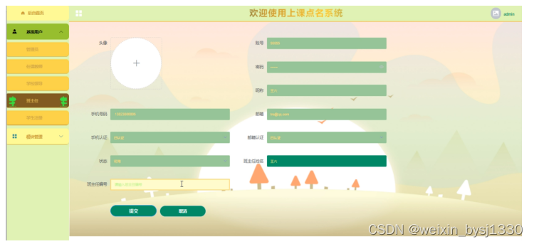管理员可以查看后台服务端后台首页、系统用户(管理员、任课老师、学校领导、班主任、学生注册)、模块管理(课程类别、课程信息、课程签到、公告信息、签到提醒)等操作,学校领导功能模块跟管理员功能模块相同。管理员服务端效果图如图5.2所示。