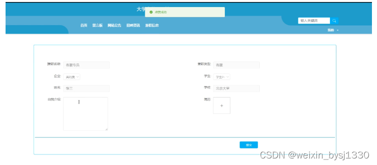 兼职报名,学生用户可以在兼职信息页面中点击报名,填写并提交兼职名称、兼职类型、企业、学生、姓名、学校、自我介绍、简历等信息进行报名,如图5-7所示。
