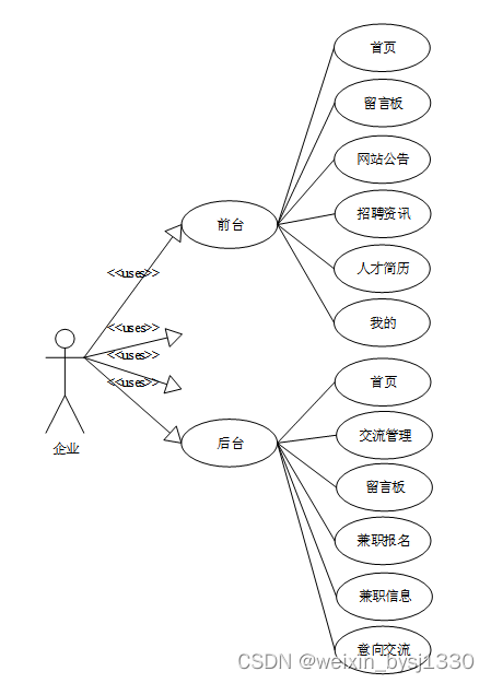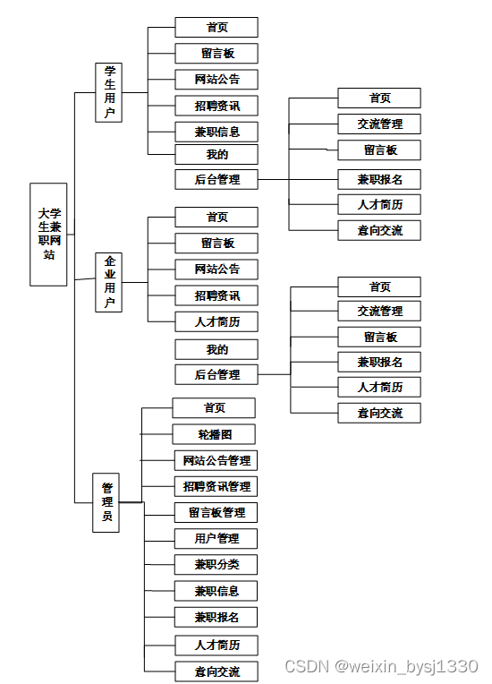 大学生兼职网站总体分为学生模块、企业模块和管理员模块。