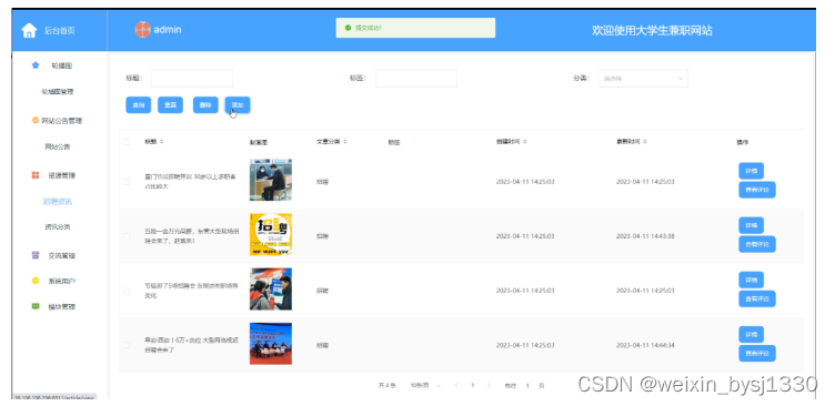 招聘资讯管理,在招聘资讯管理页面中可以查询、重置、添加、删除标题、封面、文章分类、标签、创建时间等信息,并可进行详情、查看评论等操作,如图5-13所示。