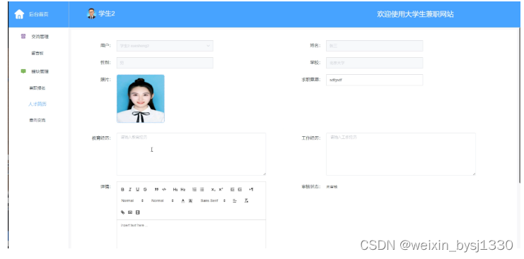 人才简历管理,人才简历管理页面中可以填写并提交用户、姓名、性别、学校、照片、求职意愿、教育经历、工作经历、详情等信息,并可查看审核状态,如图5-14所示。