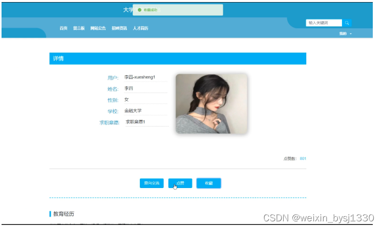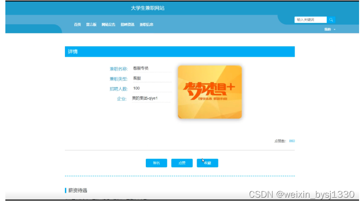 兼职信息,学生用户可以在兼职信息页面中查看兼职信息详情,并进行报名、点赞、收藏、评论等操作,如图5-6所示。