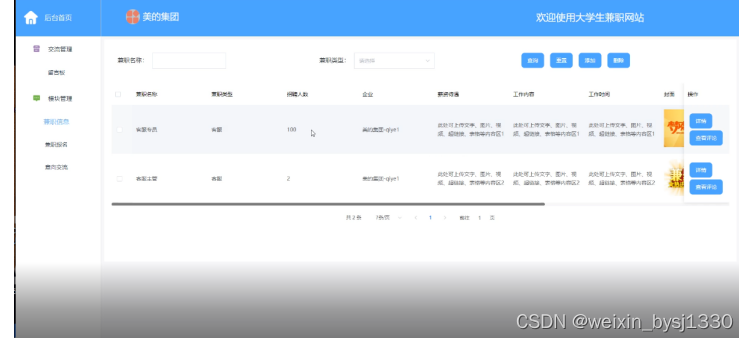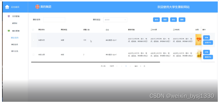 兼职信息管理,兼职信息管理页面中可以查询、重置、添加、删除兼职名称、兼职类型、招聘人数、企业、薪资待遇、工作内容、工作时间、封面等信息,并可进行详情、查看评论等操作,如图5-16所示。