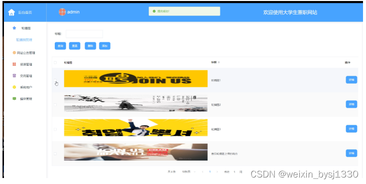 轮播图管理,在轮播图管理页面中可以查询、重置、添加、删除萝卜兔标题、图片等信息,并可进行详情等操作,如图5-11所示。