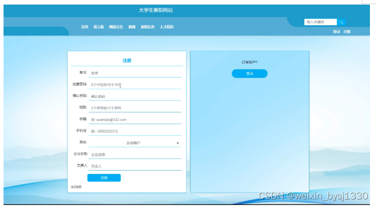 企业登录进入大学生兼职网站可以查看首页、留言板、网站公告、招聘资讯、人才简历、我的等内容。如图5-6所示。