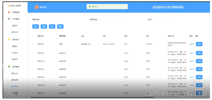 大学生兼职网站主要功能模块包括系统管理员:首页、留言板、网站公告、招聘资讯、人才简历、我的(我的账户、我的收藏、个人中心:后台首页、交流管理、留言板、兼职信息。兼职报名、意向交流),采取面对对象的开发模式进行软件的开发和硬体的架设,能很好的满足实际使用的需求,完善了对应的软体架设以及程序编码的工作,采取MySQL作为后台数据的主要存储单元,采用springboot框架、java技术、Ajax技术进行业务系统的编码及其开发,实现了本系统的全部功能。本次报告,首先分析了研究的背景、作用、意义,为研究工作的合理性打下了基础。针对大学生兼职网站的各项需求以及技术问题进行分析,证明了系统的必要性和技术可行性,然后对设计系统需要使用的技术软件以及设计思想做了基本的介绍,最后来实现大学生兼职网站和部署运行使用它。