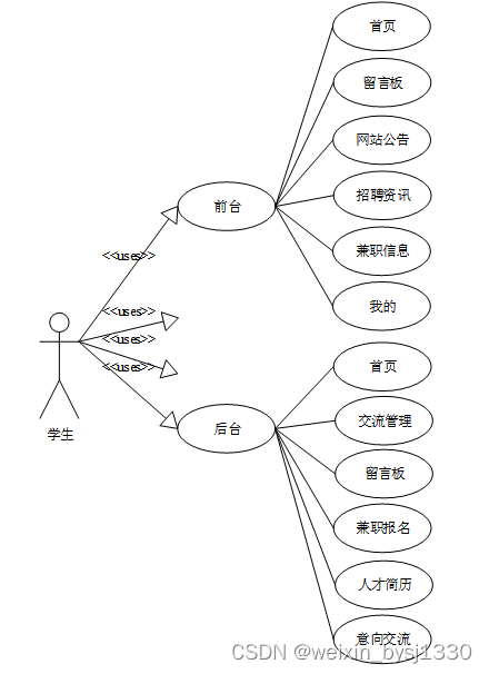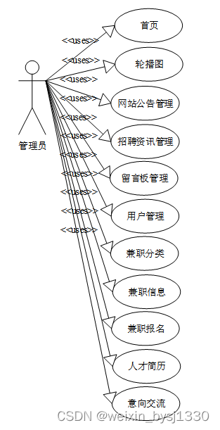 大学生兼职网站的功能主要分为前台学生用户根据自己的需求进行注册登录,浏览兼职信息并对选中的职位进行报名操作;企业用户发布自己的招聘信息,浏览学生的简历信息,对感兴趣的学生发出意向交流等。后台系统管理员因职责的不同,主要对注册用户,招聘资讯、人才简历、兼职报名信息进行管理。