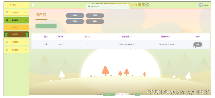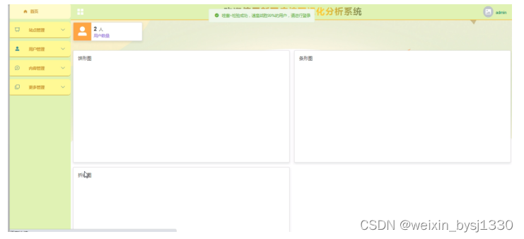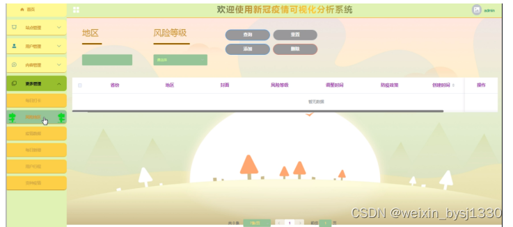 管理员登录进入新冠疫情可视化分析系统 可以查看后台首页、站点管理(轮播图、公告栏)、用户管理(管理员、系统用户)、内容管理(疫情舆情、舆情分类)、更多管理(每日打卡、风险地区、疫情数据、每日新增、用户行程、变种疫情)等信息,如图5-2所示。