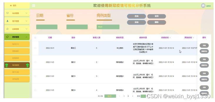 每日新增管理,在每日新增管理页面中可以查看日期、省份、新增人数、病例类型、病例来源等信息,还可以根据需要进行评论、修改或删除等操作,如图5-7所示。